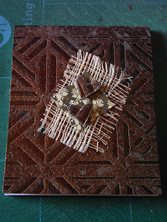 I then used some more scraps I'd found when I moved my craft stuff recently.  I'd got a small piece of woven stuff and a die cut square I'd had as a freebie.  I used a small heart stamp to stamp and emboss onto an even smaller scrap of the paper and cut them out.