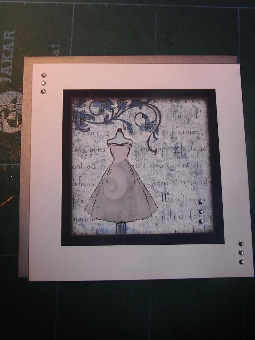 I used a complimentary blue ink to stipple around the dress image on the blank card and painted in the swirls with the same blue ink.