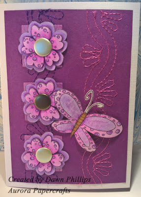 I have to admit, now I've made the card it looks totally different from the original sketch. I will admit to using a rectangle instead of a square and I did use the cut out butterfly instead of the circle (well it is me, it wouldn't be one of mine without some fussy cutting) but I think I spaced my flowers too far apart. As the backing paper has stitching on already I didn't add any string or ribbon.